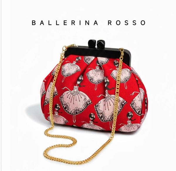 La clutch “Le Pasticcino Winter” è un accessorio dal design unico che unisce artigianalità e creatività. Realizzata in cotone e nylon con stampe in rilievo, presenta una maniglia in legno, pomelli laccati e una catenina interna oro, per aggiungere un tocco raffinato e funzionale ai tuoi outfit serali.