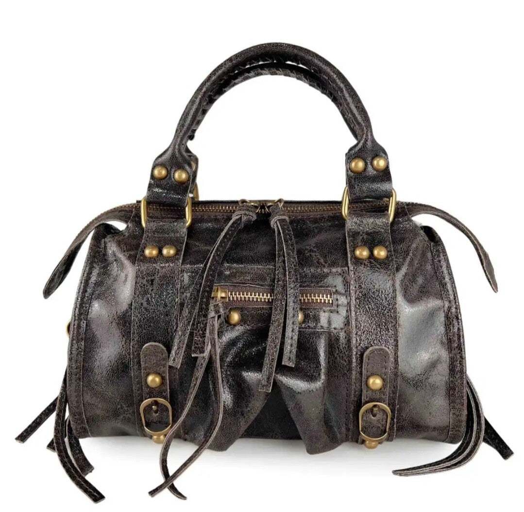 Realizzata in vera pelle italiana con effetto vissuto, presenta dettagli metallici color ottone e un design strutturato che la rende un accessorio unico nel suo genere. Le sue dimensioni compatte (26×18 cm) la rendono pratica per tutti i giorni, mantenendo un look ricercato e distintivo.