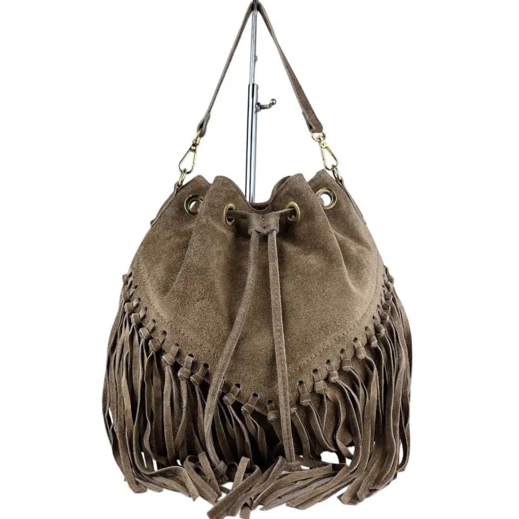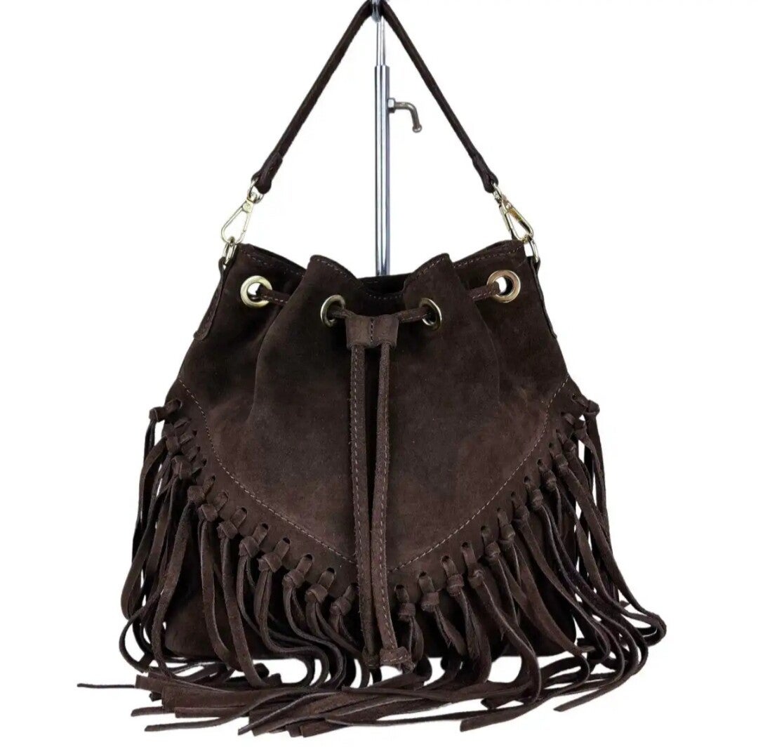 Il secchiello "Samira" in camoscio con frange Anem Bags è un accessorio dal carattere deciso e dallo stile boho-chic, perfetto per valorizzare ogni outfit con un tocco di artigianalità italiana. Realizzato in vera pelle scamosciata e rifinito con frange morbide e dettagli curati, unisce estetica e funzionalità in un design intramontabile.