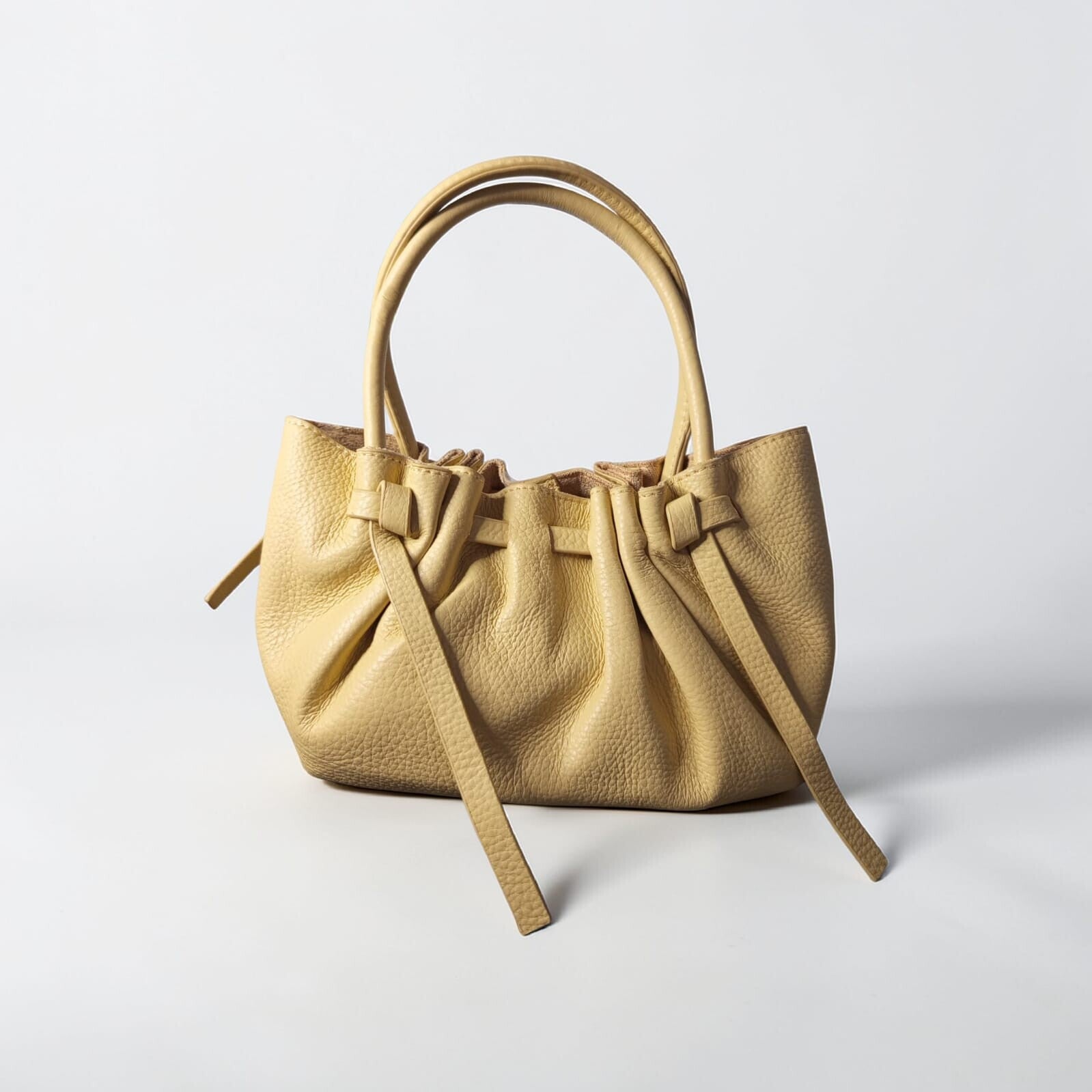 Il design arricciato con chiusura a coulisse dona alla borsa uno stile contemporaneo e raffinato, mentre il doppio manico consente di portarla comodamente a mano. La tracolla regolabile e removibile permette invece di indossarla a spalla o a tracolla per una maggiore praticità.